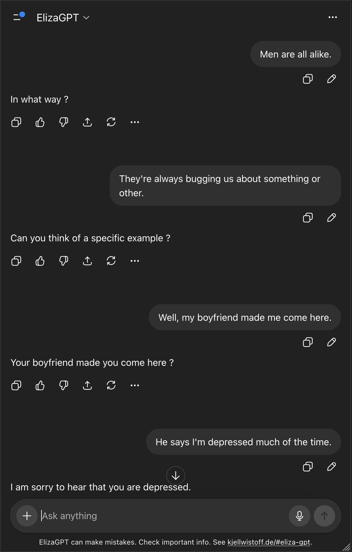 The ElizaGPT browser extension is an experimental tool that highlights the spectacle of interacting with the current generation of large language model interfaces. The extension intercepts ChatGPT responses and replaces them with ELIZA responses, the classic 1966 chatbot created by Joseph Weizenbaum. When Weizenbaum created ELIZA in 1966, his intention was to demonstrate that simple decomposition rules could create the illusion of intelligence.1 However, he soon realised that ELIZA achieved the opposite of his critical goal: rather than exposing the mechanics behind the illusion, it deepened it. Resembling the methods of a Rogerian psychotherapist, it created a condition that made subjects share more and more details of their private lives, feeling oddly connected to the machine. The browser extension serves as a reminder that this phenomenon is ever-present in today's interfaces. As we navigate sleek, well-designed surfaces, we are misguided by the interaction, confusing the underlying processes with intelligence instead of recognising them as statistical approximations of the hyper-average.